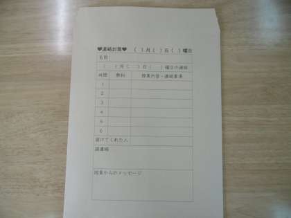 本校では欠席生徒への配付物は学校で決められた連絡封筒に入れて、仲間づくりの観点から、原則子どもたちが欠席生徒の自宅に届けています。連絡封筒には、班員からのメッセージがいつも書かれています。