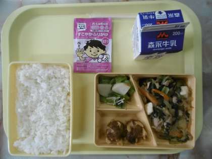 今日のメニューは、白ごはん、豆腐のチャンプル、揚げシューマイ、チンゲン菜とえのきの和え物、ふりかけ、牛乳です。