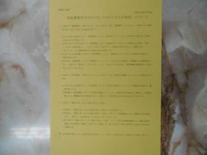 本日、「気象警報発令時の対応(令和6年5月現在)について」のプリント(黄色)を全家庭に配付しています。緊急時の対応になりますので、必ずご一読いただき、ご自宅のよく見えるところに貼っておいてください。なお、ホームページ横のリンクにも同様の電子データを掲載しています。