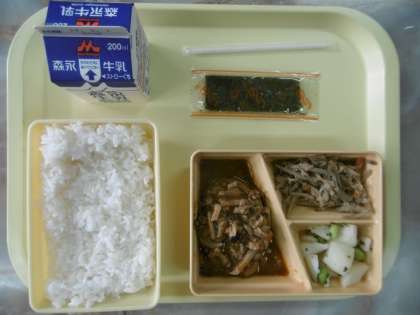 今日のメニューは、白ごはん、デミグラスハンバーグ、ごぼうサラダ、じゃが枝豆、のり、牛乳です。
