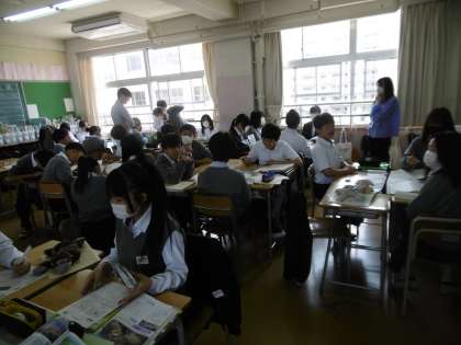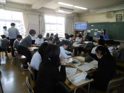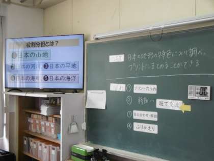 授業のめあては「日本の地形の特色について調べ、プリントにまとめることができる」でした。今日も授業で使用するプリントと説明用のパワーポイントが、本当に丁寧に作られていました。