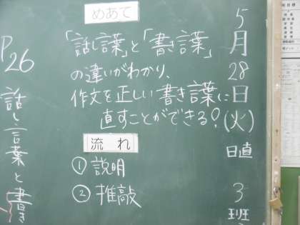授業のめあては「話し言葉と書き言葉の違いが分かり、作文を正しい書き言葉に直すことができる」でした。46期生の子どもたちは、教科担当の先生の話を静かによく聞いていました。