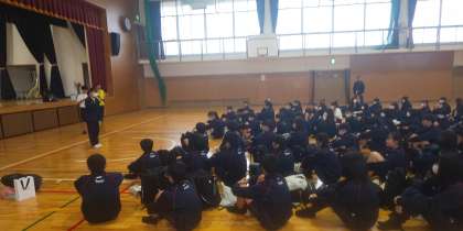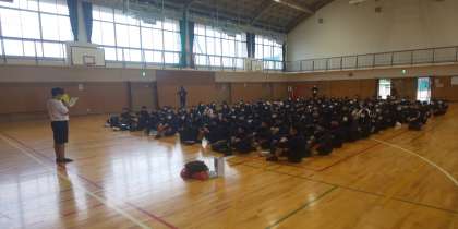 出発式が時間通りに始まりました。実行委員の生徒の進行もとても上手でした。実行委員長のあいさつも抜群でした。いい宿泊学習になる予感がした出発式でした。これからバスに向かいます。