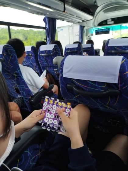 バスレクが始まりました。ビンゴゲーム大会がレク係の進行で盛り上がっています。みんな楽しそうです。