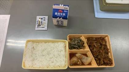 今日の献立はごはん、マーボー春雨、鶏肉の照り焼き、ほうれん草ともやしのかつお和え、塩昆布、牛乳です。いただきます。