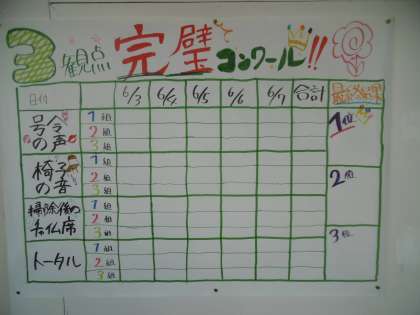 先日行われた生徒委員会で、「コンクールを行うことで授業開始のあいさつの声は大きく、椅子の移動の音を小さくし、チャイム着席をしっかり守ることができるようにしたい。」との意見が出され、話し合いの結果、「3観点完璧コンクール」が今週、行われることになっています。3つの観点は「授業開始時のあいさつ」、「椅子の音」、「掃除の後の着席」です。3年生(45期生)の自治的活動がさらに高まっていくことを願っています。