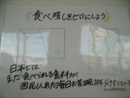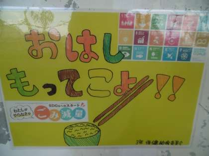 保健給食委員会が素敵な掲示物を作成してくれました。SDGsの観点から、「食べ残し0」や「お箸を持ってこよう」が呼びかけられています。皆さんのご協力をお願いします。