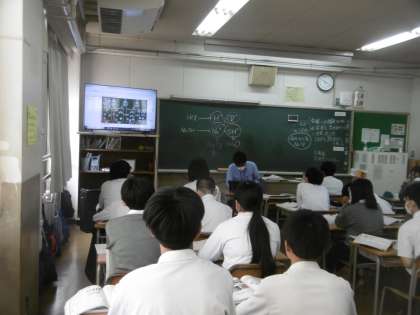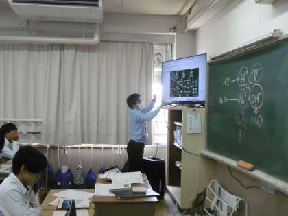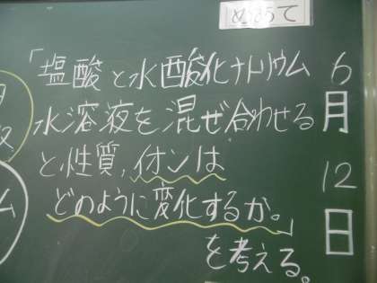 授業のめあては「塩酸と水酸化ナトリウム水溶液と混ぜ合わせると、性質、イオンはどのように変化するかを考える」でした。物音ひとつしない本当に静かな授業で、子どもたちは集中して教科担当の先生の説明を聞いていました。