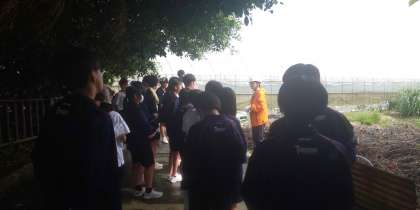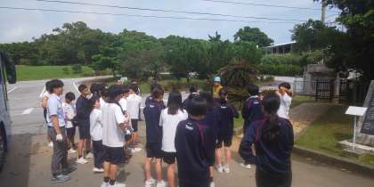 これからヌヌマチガマに入ります。子どもたちは、ガイドさんのガマについての説明を真剣に聞いています。気温がぐんぐん上がり、とにかく暑いです。