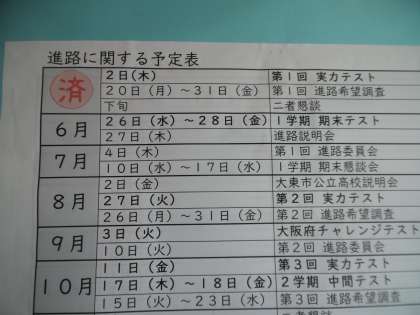 2階廊下の進路用の掲示物に6月分に「済」の印が貼ってありました。自分の進路の予定を今から考えておくことは、とても大切なことです。