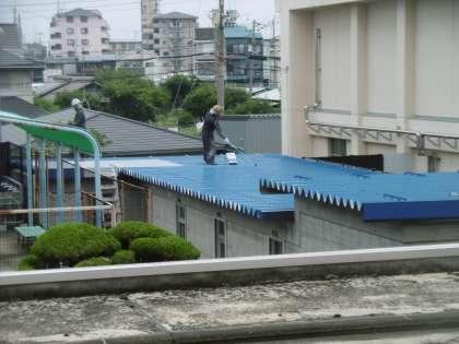 プール更衣室の屋根のペンキ塗りの作業が進んでいます。青色の屋根になるようです。入口の門とともに、よりプールがきれいになりました。