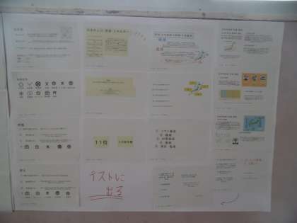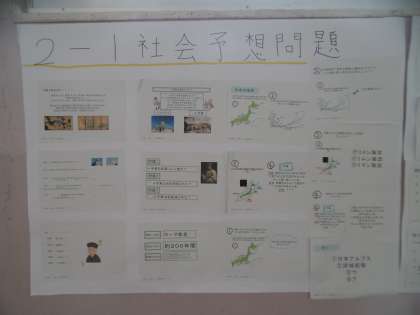 国語科、社会科で取り組んだ「期末テスト予想問題」がみんなが見やすいように壁新聞として掲示されていました。テストまで今日で6日目前となりました。土日の部活動も公式戦を除いてありません。生徒の皆さんには「テスト前の徹底した勉強」を期待しています。