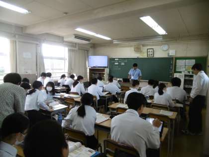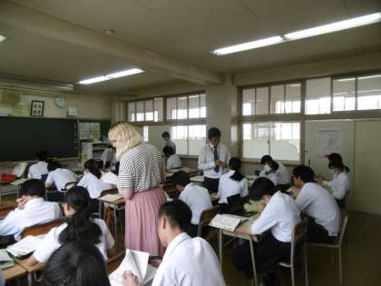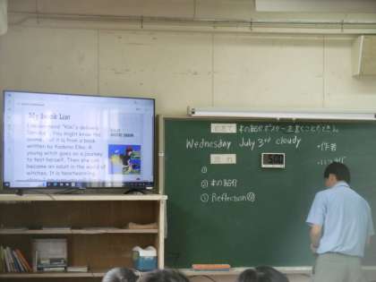 授業のめあては「本の紹介ポスターを書くことができる」でした。AET(英語実習助手)の先生に、英語で日本の本を紹介するためのポスター作りに取りかかっていました。教室には4人も英語の教員がいて、とても質問しやすい環境になっていました。