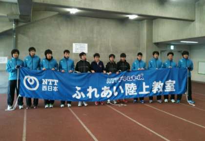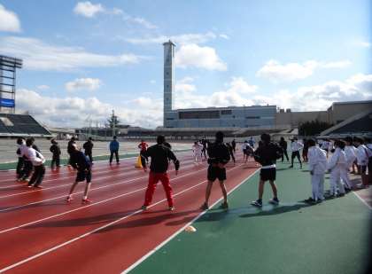 元旦のニューイヤー駅伝にも出場したNTT西日本の実業団チームの現役選手やコーチから直接指導を受けることができました。講習や走るスピードを徐々に上げるビルドアップ走のあと、練習の最後に駅伝を行いました。参加選手が5名×20チームにわかれて、競技場周りのコース5区間で競いました。