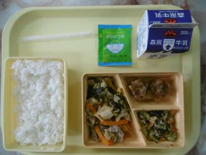 今日のメニューは、白ごはん、豚キムチ、コーンシューマイ、チンゲン菜の大豆和え、ふりかけ、牛乳です。