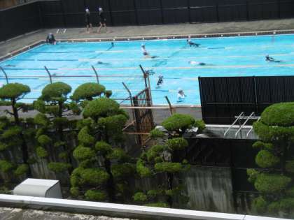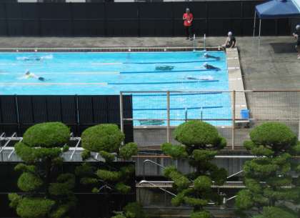 今年一番の暑さの中での水泳の授業。生徒の歓声が校舎まで聞こえていました。気持ちよかったようです。暑さ対策として、簡易テントを設置しました。