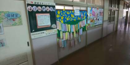 写真は保健室前廊下の掲示物です。本校の養護教諭が今日の七夕に向けて素敵な掲示物を作成してくれました。願い事を書いて、廊下に掲示しています。先生方や生徒が書いた短冊もあり、たくさんの生徒がこの笹を見て、楽しんでいます。今週から始まる期末懇談で来校されましたら、是非ご覧ください。