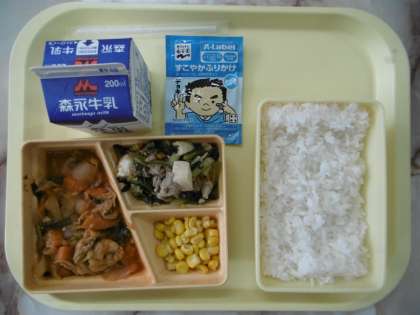 今日のメニューは、白ごはん、ダッカルビ、小松菜のチャンプル、ボイルコーン、ふりかけ、牛乳です。