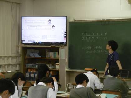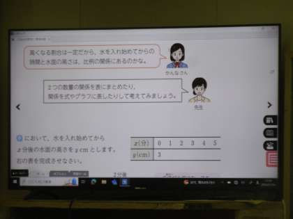 学習単元は「一次関数」でした。1年生で学習した比例や反比例をさらに深く学習していきます。問題をイメージし、解くための方法の図や表、グラフ、式について、一次関数を学習を通して関連性を学びます。
