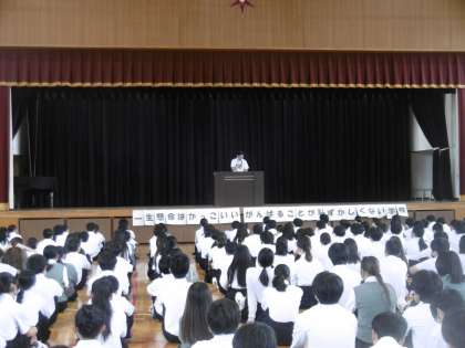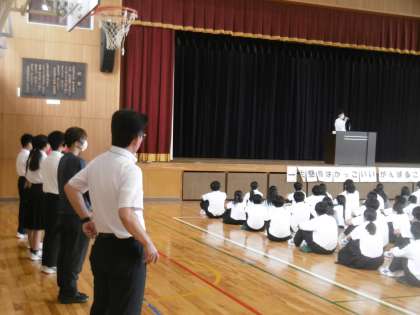 校長からは「一生懸命はかっこいい」や「がんばることが恥ずかしくない学校」の言葉を紹介し、服装の乱れからくる心の乱れについて生徒に話をしました。