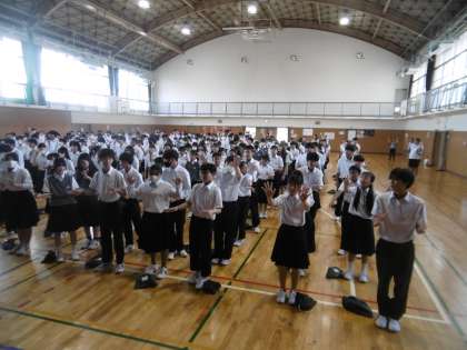 全校集会の最後は、今年の生徒会のスローガンの「まきこめ♯315」のポーズをして、温かい雰囲気の中で全校集会が終了しました。今日も本校生徒会役員の全校集会の進行は抜群でした。