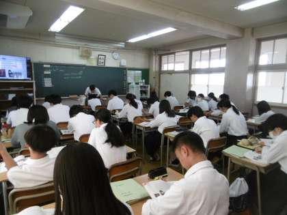 今日は6時間目に授業改善研究会が3年2組で行われます。2時間ある英語の授業でも、3年2組の生徒は普段通りに一生懸命に授業を受けていました。45期生の当たり前の行動の高さに感心しました。
