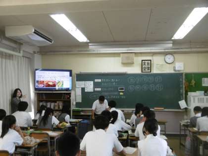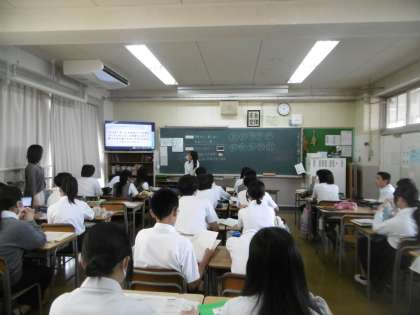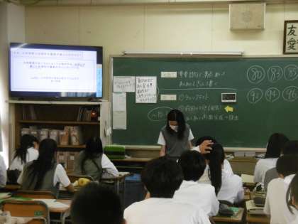 タブレットパソコンを使って、自分で調べたことをみんなの前で発表するプレゼン授業が行われていました。発表者の発表する態度とその発表を聞く態度の両方が本当に見事でした。発表後に自然に起こる拍手もとてもよかったです。46期生の学年の力の高さを感じました。発表テーマは「九州地方では、なぜ環境保全に努めているのだろう?」でした。