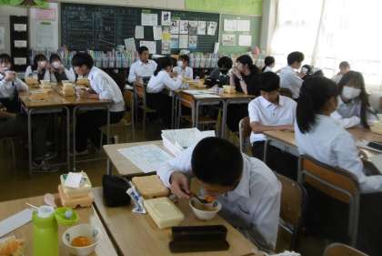 写真は上から、3年1組、3年2組、3年3組です。1学期の給食も残すところ、あと3回になりました。いい形で1学期を終えましょう。「終わりよければすべてよし!」です。