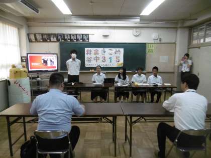 本校の生徒会役員と大東市教育委員会教育長との交流会が本日行われました。各中学校の生徒会役員と教育長との対話を通じて、中学生の意見を聞き、生徒のさらなる主体的な活動への意欲を高めることを目的として、毎年行われています。岡本教育長の名刺交換から交流会がスタートしました。自己紹介のあと、学校紹介や生徒会の取り組みなどを発表しました。普段なかなか聞けない教育長のお話は、子どもたちにとってとても新鮮だったようで、緊張した生徒会役員を初めて見ました。谷川中学校の生徒会の取り組みを思う存分伝えることができて、生徒も大満足でした。