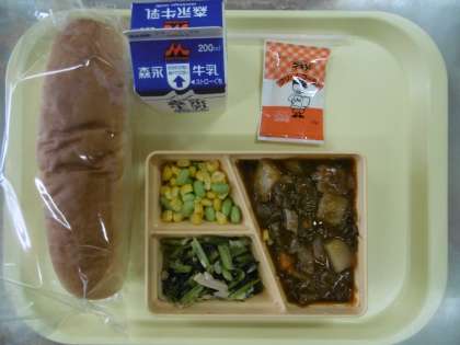 今日のメニューは、コッペパン、ビーフシチュー、小松菜のサラダ、枝豆コーン、ミルクバター、牛乳です。