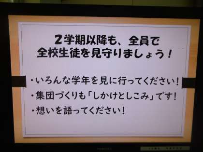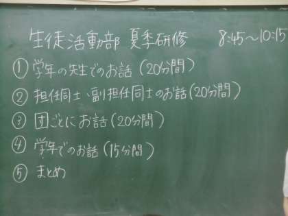 今日の午前中は、2つの職員研修会を行いました。月曜日から2学期がスタートするにあたり、各学級や各学年で1学期の振り返りを行い、2学期の集団づくり(仲間づくり)について、他学年の先生方との情報交換を含めて、目標や方針、取り組みの確認を行いました。途中、10月4日(金)に行われる体育大会での縦割り活動(赤団・青団・緑団)のグループごとに分かれ、子どもたちの達成感や自己有用感を高めるために必要な取り組みなどについて話し合いました。1時間30分間の研修が和やかなとてもいい雰囲気の中で行われたことが、先生方の2学期への意気込みの表れと感じました。