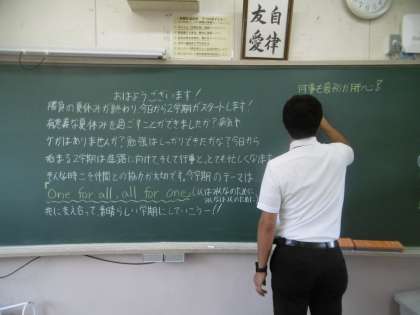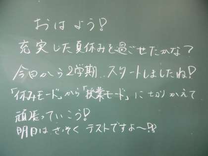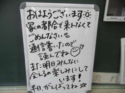 写真は上から、1年1組、2年3組、3年2組です。3年2組は、朝早くに教室で担任の先生が黒板にメッセージを書いているところを見つけました。うれしそうに黒板にメッセージを書いていたことが印象的でした。
