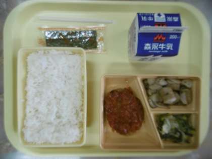 今日の給食は、白ごはん、ハンバーグBBQソース、ソーセージときのこのアヒージョ風、ポパイソテー、のり、牛乳です。