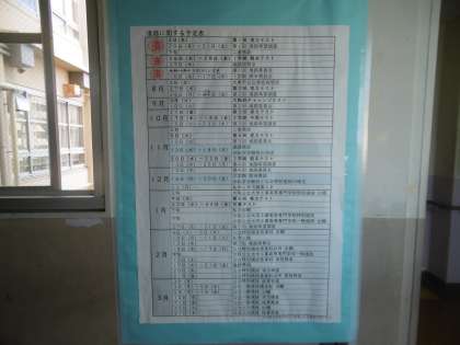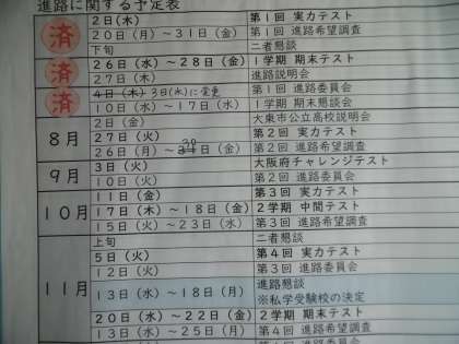進路関係の予定が2階廊下に掲示されています。行事などが終わるごとに、進路担当の先生が「済」のマークを付けてくれています。先を見通し、自分の進路について、計画的に進めていきましょう。