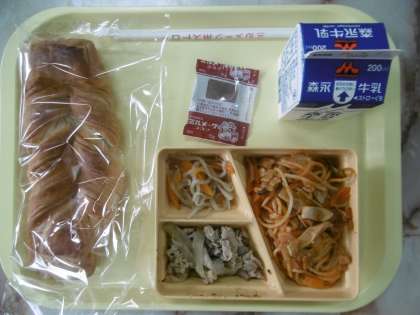 今日のメニューは、デニッシュパン、スパゲティナポリタン、豚肉のガーリック炒め、もやしの和え物、ミルメーク、牛乳です。
