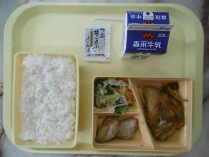 今日のメニューは、白ごはん、サーモンフライの野菜ソースかけ、豚肉の香草焼き、チンゲン菜の炒め物、塩こんぶ、牛乳です。