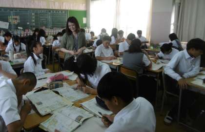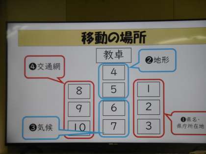 班ごとに決められた係分担を協力して行っているところです。1県名・県庁所在地、2地形、3気候、4交通網の4つを班ごとに調べ、学習プリントを完成させていました。熱気を感じる教室でした。やはり、46期生(2年生)は仲間と協力しながら行う活動にいつも意欲的です。