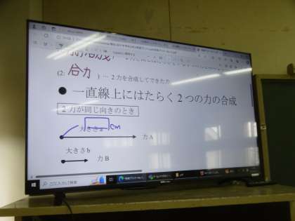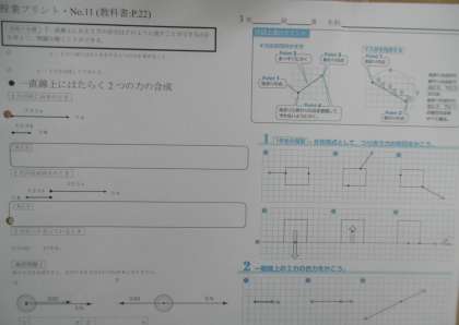 学習内容は「一直線上にはたらく2つの力の合成」でした。学習プリントを使いながら、実際に2つの力の合成についての作図をしていました。