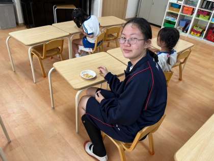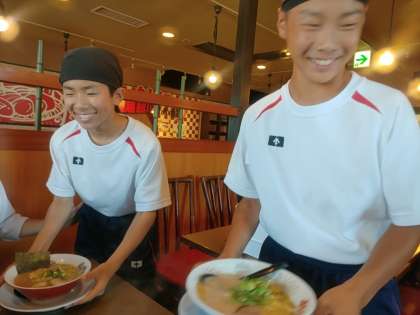 写真は上から、ふくちゃんラーメン 大東店、住道こども園です。実にいい表情をしています。学校では体験できない活動が笑顔に繋がっています。