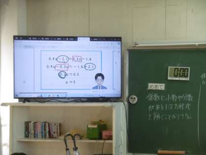 係数(文字の前にある数字のこと)に小数や分数がある一次方程式の解き方についての授業でした。席の隣にいる仲間と随時、ペアで学習する時間があり、テンポよく授業が今日も進んでいました。