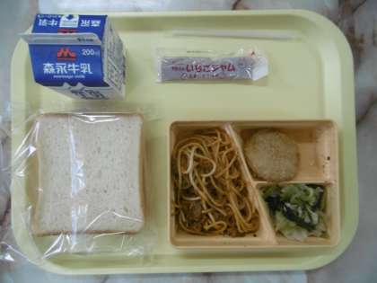 今日のメニューは、食パン、スパゲティミートソース、コーンコロッケ、小松菜のサラダ、いちごジャム、牛乳です。