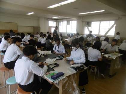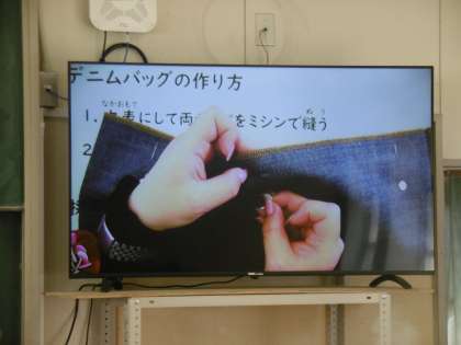 デニム作りを行っていました。教科担当の先生が手元がよく見えるように、ICT機器を使って生徒に見本を示し、丁寧に作製過程を見せていました。本校にいる2名の介助員さんも応援にかけつけてくれました。悪戦苦闘しながらも、なんとかいい作品を仕上げようとする2年生(46期生)の態度に感心しました。