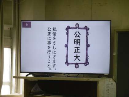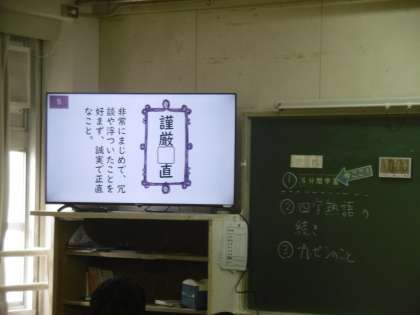 四字熟語の復習をしていました。覚えた四字熟語の解答をテンポよく、生徒は答えていました。興味をもつことで、、暗記力を高めてほしいと思っています。説明用のパワーポイントが、とても分かりやすく、丁寧に作られていました。