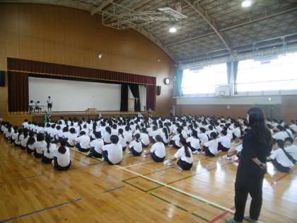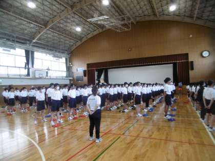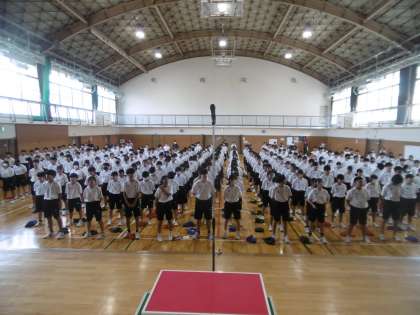 今日も暑さ指数を表すWBGT計の数値が高いため、エアコンの効いた体育館での練習に切り替えました。体育大会実行委員の進行のもと、開閉会式の練習、歌(国歌・校歌)の練習、礼の練習を行いました。