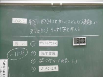 「中国・四国地方にはどんな課題があるかを知り、その対策を考える」というめあてに向かって、話し合い活動や学習プリントが効率よく使われていました。