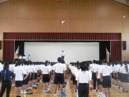 今日も暑さ指数を表すWGBT計の数値が高く、熱中症が心配されたため、体育館での練習に切り替えました。出場種目ごとに招集練習をしたあと、各団(赤団・青団・緑団)に分かれて、応援練習をしました。