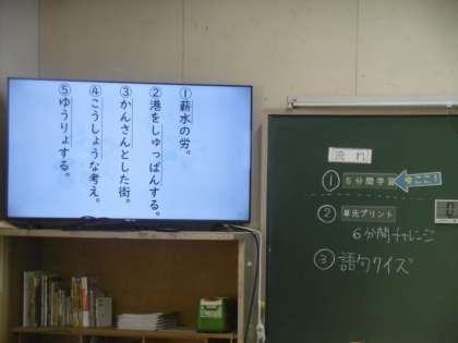 授業前の5分間学習を行っていました。休み時間からの切り替えも抜群で、すぐに集中して授業に入ることができる学年にいつも感心しています。