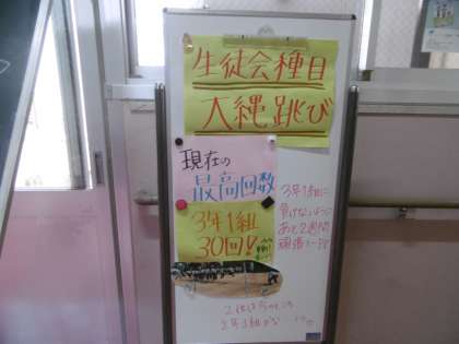 同じく、生徒会役員からです。日に日に昼休みの練習が盛り上がってきている要因がこの黒板にあるようです。体育大会の生徒会種目である「大縄跳び」の現在の練習最高記録数が毎日、ここに掲示されています。9月20日現在、第1位は3年1組、第2位は2年3組です。