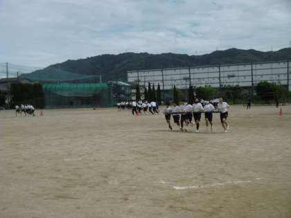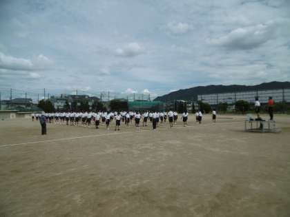 随分涼しくなったグラウンドで、2年生の学年練習が行われていました。体育大会での2年生の学年種目は、台風の目です。生活班(6人)で棒をバトン代わりにリレー形式で競います。2つのコーンをクロスに回り、最後に棒を立てたクラスが優勝となります。学年練習はあと1時間予定されています。がんばりましょう。