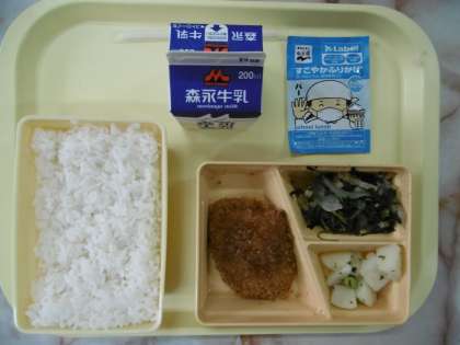 今日のメニューは、白ごはん、チキンカツソースかけ、ベーコンとほうれん草の炒め物、じゃが枝豆、ふりかけ、牛乳です。